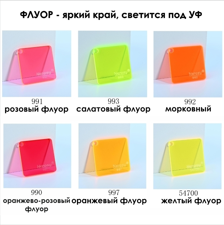- Акрил полупрозрачный Флуоресцентный - ФЛУОР (светится под уф-излучением, а не сам в темноте!). Сам по себе очень яркий при дневном свете.